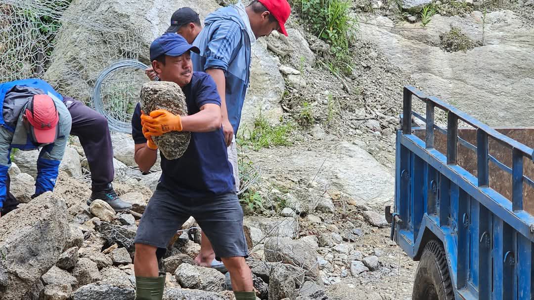 काठे पुल निर्माणको लागि ढुँगा ओसार्दै पालिका अध्यक्ष
