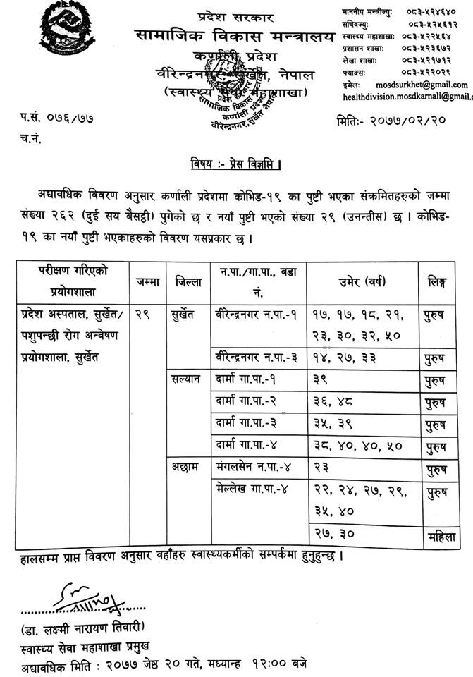 कर्णालीमा थप २९ जनामा कोरोना, संक्रमितको संख्या २६२ पुग्यो