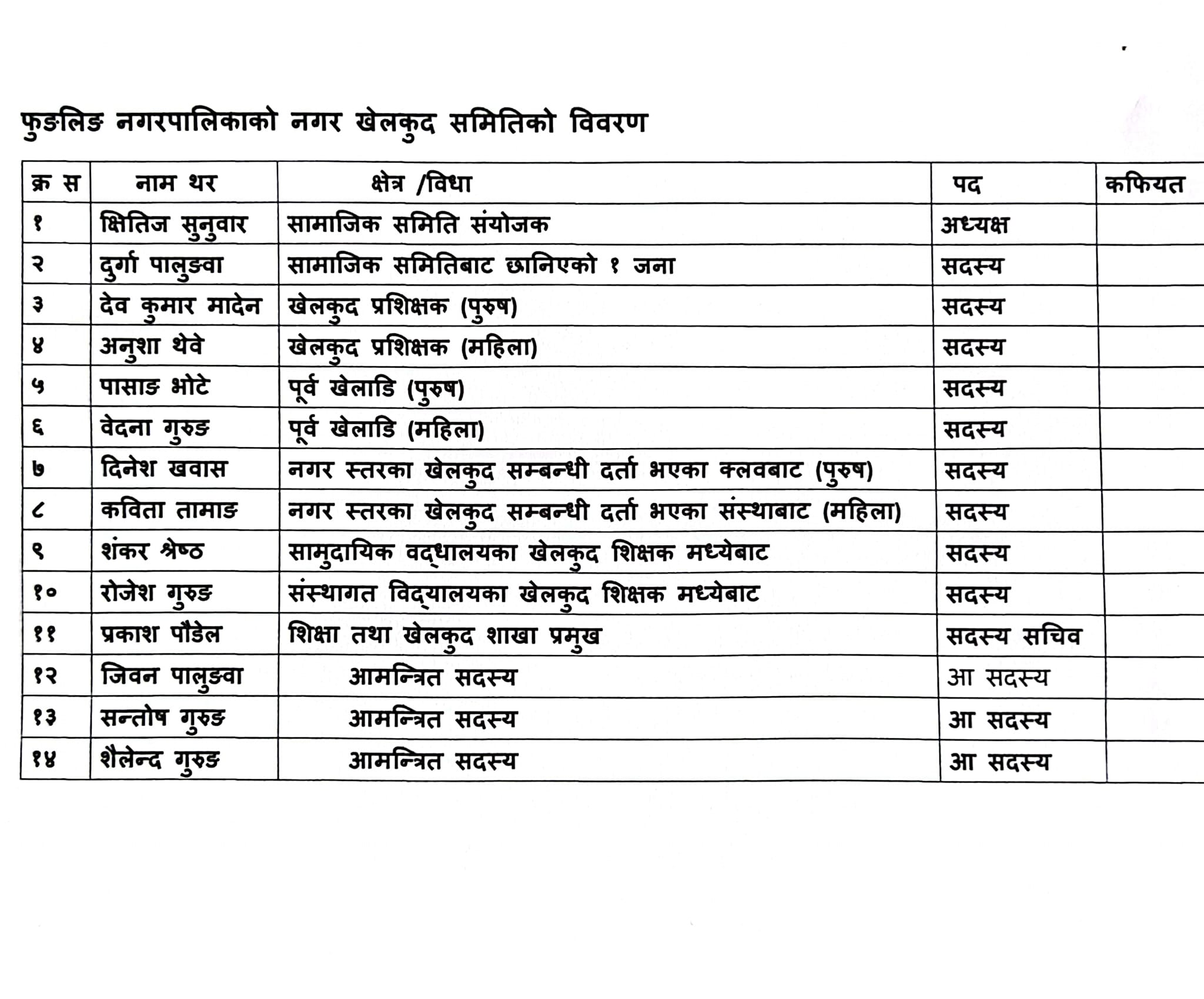 आज गठन भएको समितिमा सदस्यहरुमा सामाजिक समितिबाट फुङलिङ नगरपालिका वडा ४ का वडा अध्यक्ष दुर्गा पालुङवा,खेलकुद प्रशिक्षक पुरुषबाट देवकुमार पालुङवा,खेलकुद प्रशिक्षक महिलाबाट अनुशा थेवे,पूर्व खेलाडी पूरुषबाट पासाङ शेर्पा पूर्व खेलाडी महिलाबाट वेदना गुरुङ,नगर स्तरका खेलकुद सम्बन्धि दर्ता भएको क्लब पुरुष तर्फ दिनेश खबास,नगर स्तरका खेलकुद सम्बन्धि दर्ता भएको क्लब महिला तर्फबाट कविता तामाङ,सामुदायिक विद्यालय खेलकुद शिक्षकबाट शंकर श्रेष्ठ,संस्थागत विद्यालय खेलकुद शिक्षकबाट राजेश गुरुङ,शिक्षा तथा खेलकुद शाखा प्रमुख सदस्य सचिव प्रकाश पौडेल र आमन्त्रित सदस्यहरुको जीवन पालुङवा सन्तोष गुरुङ र शैलेन्द्र गुरुङ रहेको छन ।
