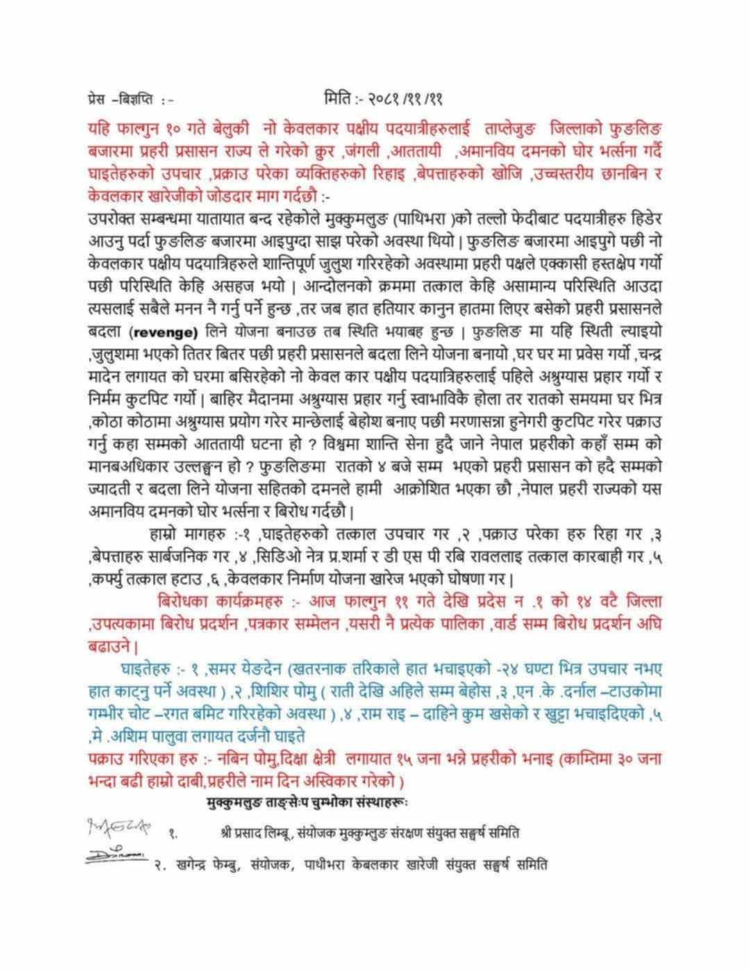 विज्ञप्तिमा भनिएको छ घाइतेहरूको तत्काल उपचार गर्नुपर्ने पक्राउ परेकाहरू रिहाइ गर्नुपर्ने बेपत्ताहरू सार्वजनिक गर्नुपर्ने सीडीओ नेत्रप्रसाद शर्मा र डी एस पी रबि रावललाई तत्काल कारबाही गर्नुपर्ने कर्फ्यु तत्काल हटाउनुपर्ने लगायतका माग राख्दै कोशी प्रदेशको १४ वटै जिल्ला उपत्यकामा विरोध प्रदर्शन, पत्रकार सम्मेलन, यसरी नै प्रत्येक पालिका वार्ड सम्म विरोध प्रदर्शन गर्ने कार्यक्रम तय गरेको छ । विज्ञप्तिमा मुक्कुम्लुङ संरक्षण संयुक्त सङ्घर्ष समिति संयोजक श्रीप्रसाद लिम्बू, र , पाथीभरा केबलकार खारेजी संयुक्त सङ्घर्ष समिति संयोजक खगेन्द्र फेम्बुको हस्ताक्षर गरेको छन ।