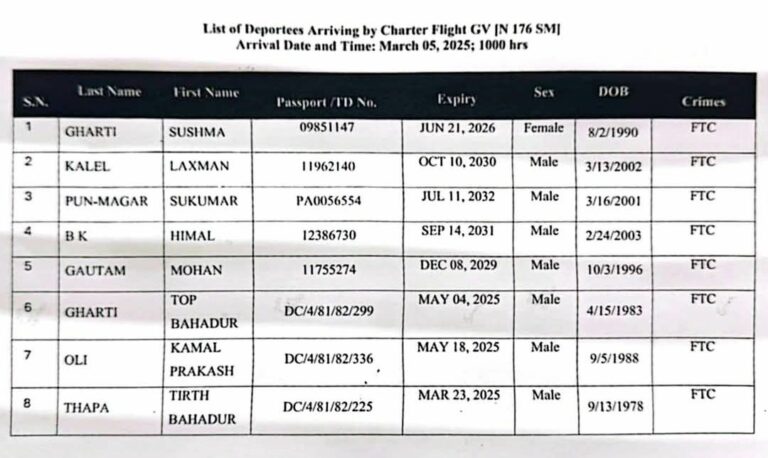अमेरिकाबाट चार्टर विमानमा ल्याइयो ८ जना आप्रवासी नेपाली (नामावलीसहित)