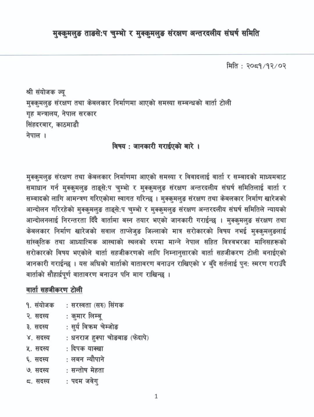 विज्ञप्तीमा मुक्कुमलुङ संरक्षण तथा केबलकार निर्माण खारेजको सवाल ताप्लेजुङ जिल्लाको मात्र सरोकारको विषय नभई मुक्कुमलुङलाई सांस्कृतिक तथा आध्यात्मिक आस्थाको स्थलको रुपमा मान्ने नेपाल सहित विश्वभरका मानिसहरूको सरोकारको विषय भएकोले वार्ता सहजीकरण लागि सरस्वता सिंघको संयोजकत्वमा ९ सदस्यीय समिति निर्माण गरिएको जनाएको छ ।