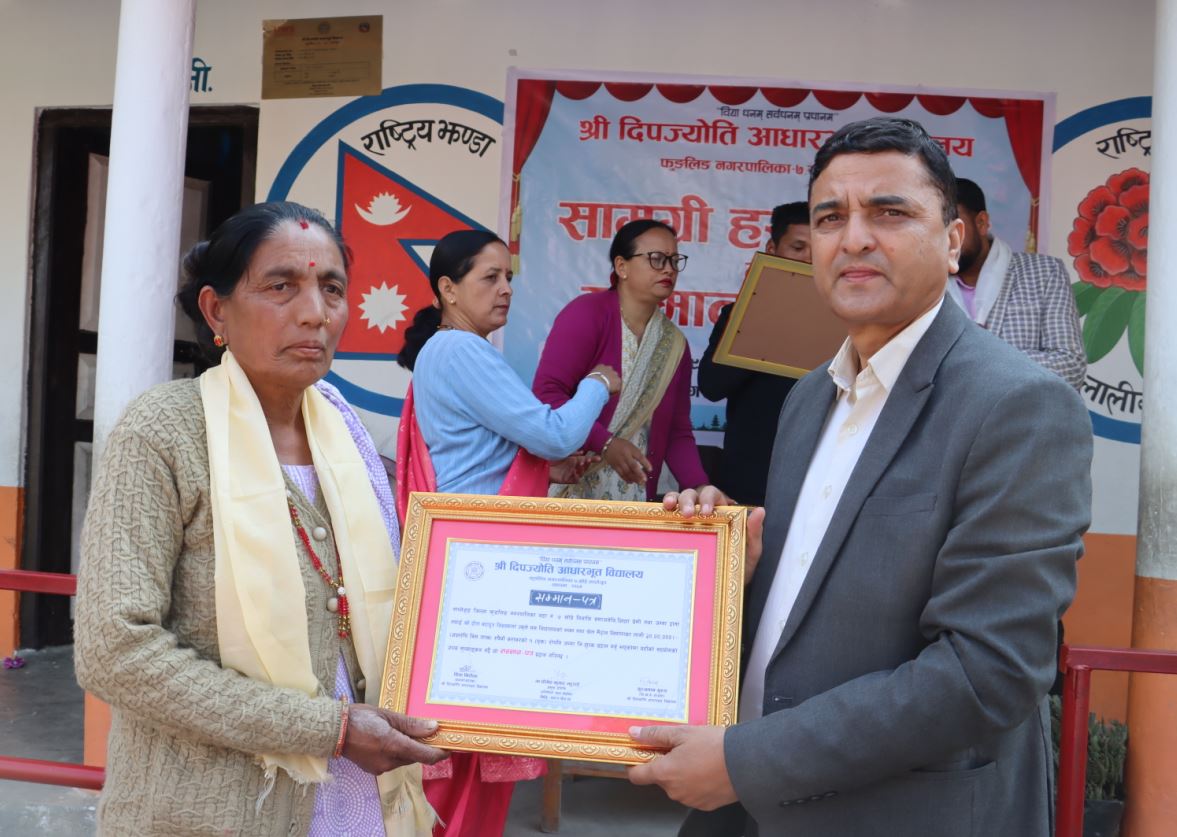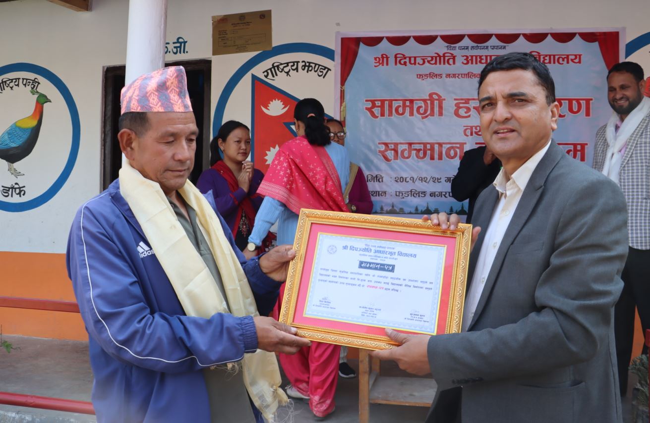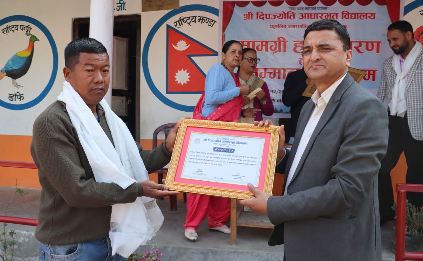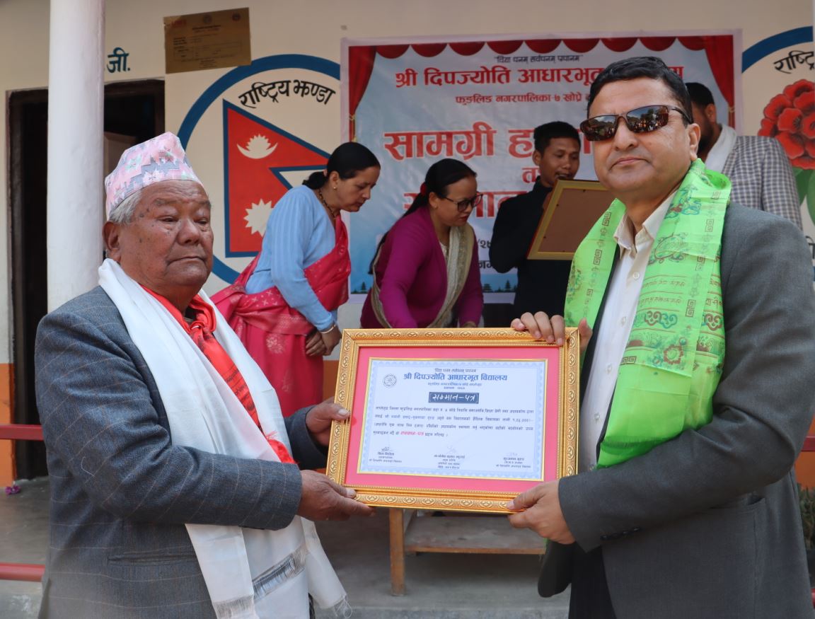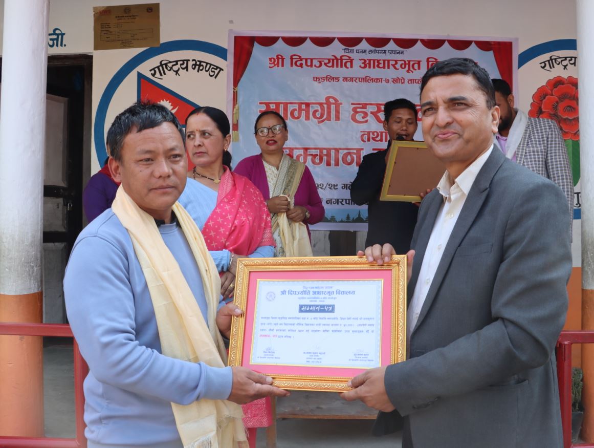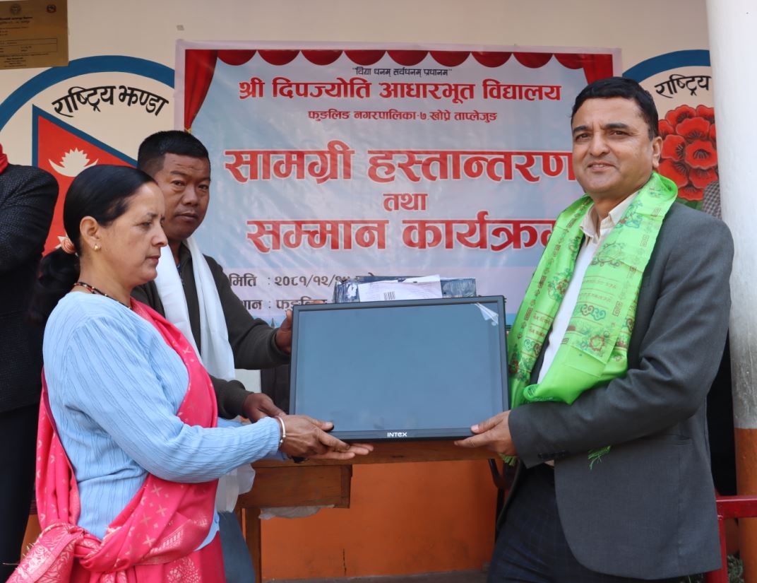 हिमालय लाइन्स क्लब अफ काठमाडौँ सिद्धार्थ प्यालेसले उपलब्ध गराएको एक लाख रकम बराबरको कम्प्युटर र प्रिन्टर प्रतिनिधिसभा सदस्य भट्टराईले विद्यालयमा कम्प्युटर हस्तान्तरण तथा सम्मान कार्यक्रममा प्रधानअध्यापक सिता निरौला र व्यवस्थापन समिति अध्यक्ष गुञ्जमान गुरुङलाई हस्तान्तरण गर्नु भएको हो । हस्तान्तरण गदै नेकपा एमालेका सचिव समेत रहनु भएका भट्टराईले ताप्लेजुङका विभिन्न विद्यालयलाई भौतिक संरचना निर्माणमा विभिन्न विद्यालयले सहयोग गरि रहेको उल्लेख गर्नुभयो । पूर्वमन्त्री समेत भईसक्नु भएका सांसद भट्टराईले युडब्लु एसले जिल्लाका विभिन्न ७ वटा विद्यालयको भवन निर्माणमा सहयोग गरेकोमा धन्यवाद प्रदान गदै विद्यालयको भवन निर्माण पछि विद्यार्थीको सङ्ख्या वृद्धि भएको समेत दाबी गर्नुभयो । दीपज्योति आधारभूत विद्यालयको जग्गादाता ,विभिन्न रुपमा सहयोग गर्नेहरूलाई सम्मान समेत गरिएको थियो ।