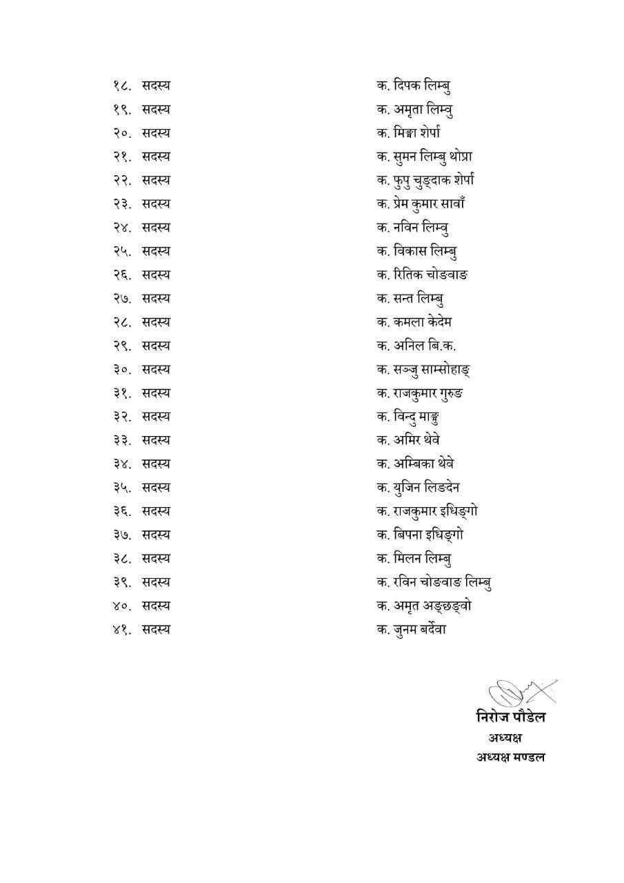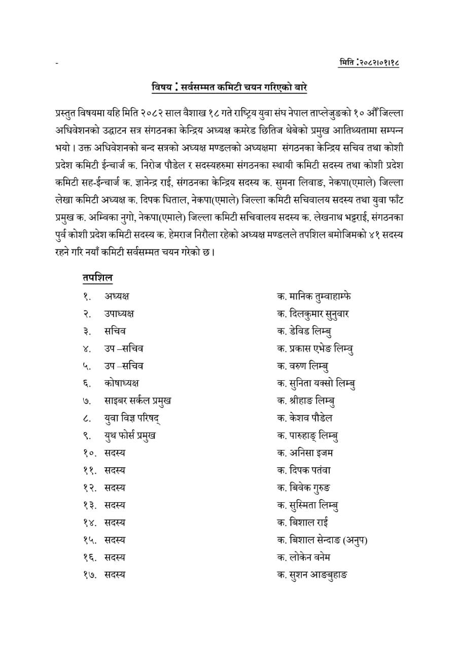 नयाँ कमिटीको उपाध्यक्षमा दिलकुमार सुनुवार, सचिवमा डेबिट लिम्बू, उपसचिवद्वयमा प्रकाश एभेङ र वरुण लिम्बू चयन हुनुभएको छ। यस्तै कोषाध्यक्षमा सुुनिता यक्सो लिम्बू, युवा विज्ञ परिषदमा केशव पौडेल साइबर सर्कल प्रमुख श्रीहाङ् लिम्बू र युथ फोर्स प्रमुखमा पारुहाङ लिम्बू चयन गरिएको निर्वाचन अध्यक्ष मण्डलका अध्यक्ष निरोज पौडेलद्धारा हस्ताक्षरीत सर्वसम्मत नामावलीमा सो उल्लेख गरिएका छ ।