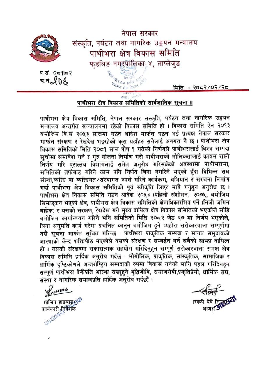 पाथीभरा क्षेत्रमा विना अनुमति कुनै पनि कार्य नगर्न क्षेत्र विकासको अनुरोध (सूचना सहित )