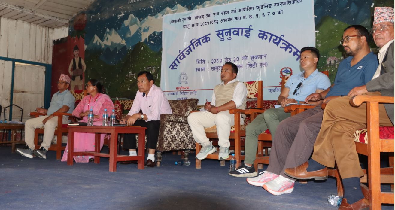 नगर प्रमुख अमिर मादेनले बताउनुभयो । कार्यक्रममा नगर उप प्रमुख भिमादेवि ओझा प्रमुख प्रशासकीय अधिकृत कृष्णप्रसाद गौतम,वडा ४ का अध्यक्ष दुर्गा पालुङवा वडा ५ का सोजित श्रेष्ठ वडा ६ का मदन गुरुङ वडा ७ योगेन्द्र निरौला र नगरपालिकाका विभिन्न विषयगत शाखाका प्रमुखहरुको सहभागिता र नगरवासीको भेलामा सार्वजनिक सुनुवाई कार्यक्रम सम्पन्न भएको हो । आँउदो सोमवार असार २ गते वडा न १, २ र ३ लाई केन्द्रीकृत गरेर वडा न २ मा सार्वजनिक सुनवाई कार्यक्रम हुने नगर प्रमुख मादेनले जानकारी दिनुभयो ।