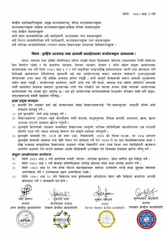 तालिका अनुसार ११ गते हरेक जिल्ला सदरमुकाममा सर्वपक्ष उपस्थिति गराई मुद्दाका विषयमा अन्तरक्रिया गर्ने र उपत्यकामा बृहत अन्तरक्रिया राख्ने र १२ गते विद्यालय बन्द हुनेसम्मको अल्टिमेटम दिएर सबै सिडिओ कार्यालय अगाडी कोणसभा गर्ने र जानकारी पत्र दिने कार्यक्रम सार्बजनिक गरेको छ । विज्ञप्तिमा अपिन अध्यक्ष बद्री दाहाल , हिसानका कार्यबाहक अध्यक्ष युवराज शर्मा , प्याब्सनका अध्यक्ष कृष्ण अधिकारी र एन प्याब्सनका अध्यक्ष सुभाष न्यौपानेले संयुक्त हस्ताक्षर गरी विज्ञप्ति जारी गर्नुभएको छ ।