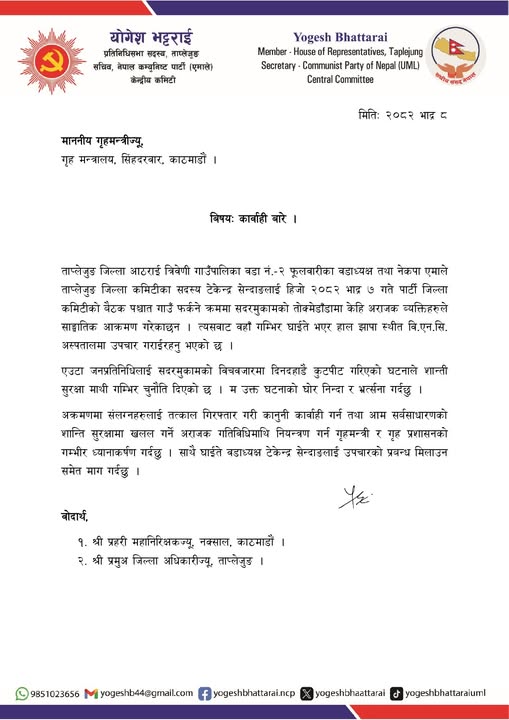 आइतवार नेकपा एमालेका सचिव तथा ताप्लेजुङका सांसद योगेश भट्टराईले गृहमन्त्री लेखकलाई भेटी तत्काल कारवाही गर्न लागि माग गरेपछि गृहमन्त्री लेखकले ताप्लेजुङका प्रमुख जिल्ला अधिकारीलाई फोन गरी वडा अध्यक्षलाई आक्रमण गर्नेहरु पक्राउ गरी कारवाहीको दायमा ल्याउन निर्देशन दिएका थिए ।