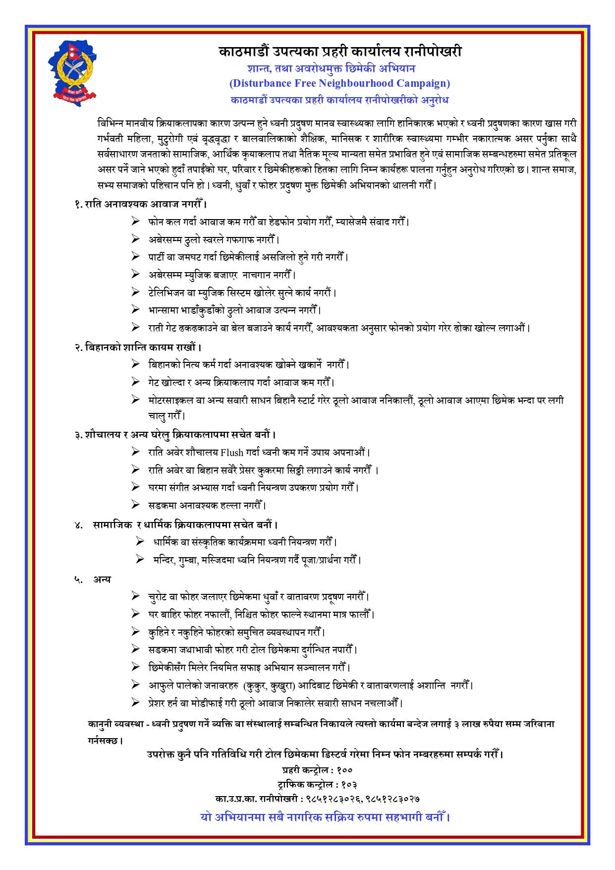 काठमाडौं उपत्यका प्रहरी कार्यालय, रानीपोखरीले सार्वजनिक सूचना जारी गरेर राति अबेर र बिहान सबेरै प्रेसर कुकरमा सिट्ठी नलगाउन ‘उर्दी’ जारी गरेको हो ।प्रहरीले ध्वनि, धुवाँ र फोहर प्रदशुषणमुक्त छिमेकी अभियानको थालनी गर्न भन्दै जारी गरेको सूचनामा बिहान नृत्य कर्म गर्दा खोक्ने–खकार्ने काम नगर्नसमेत भनेको हो । सूचनामा मोटरसाइकल वा अन्य सवारी साधन बिहानै स्टार्ट गरेर ठूलो आवाज ननिकाल्न र ठूलो आवाज आएमा छिमेकभन्दा पर लगेर चालु गर्न पनि भनिएको छ ।