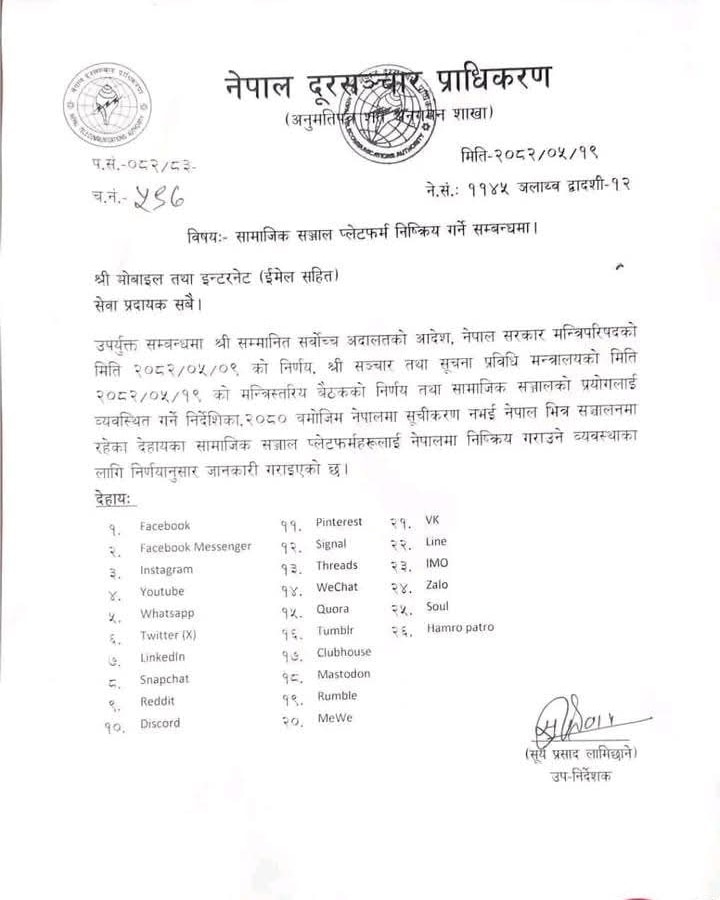 प्राधिकरणले जारी गरेको विज्ञप्तिमा भनिएको छ, ‘ सञ्चार तथा सुचना प्रविधि मन्त्रालयको मिति २०८२/०५/१९ को मन्त्रीस्तरीय बैठकको निर्णय तथा सामाजिक सञ्जालको प्रयोगलाई व्यवस्थित गर्ने निर्देशिक, २०८० बमोजिम नेपालमा सूचीकरण नभई नेपालभित्र सञ्चालनमा रहेका सामाजिक सञ्जाल प्लेटफर्महरूलाई नेपालमा निष्क्रिय गराउने व्यवस्थाका लागि निर्णयानुसार जानकारी गराइएको छ ।