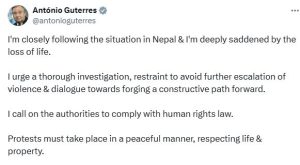 काठमाडौं । संयुक्त राष्ट्रसंघका महासचिव एन्टोनियो गुटेरसले नेपालको अवस्था नियालिरहेको बताएका छन् । नेपालको पछिल्लो अवस्थाबारे सामाजिक सञ्जाल एक्समा धारणा राख्दै मानवीय क्षतिप्रति दु:ख व्यक्त गरेका छन् । गुटेरससले हिंसालाई थप बढ्नबाट रोक्न संमय अपनाउन र संवाद गर्न अनुरोध गरेका छन् । मानव अधिकार कानूनको पालना गर्न आह्वान गर्दै गुटेरसले जीवन र सम्पत्तिको रक्षासहित शान्तिपूर्ण तरिकाले विरोध प्रदर्शन हुनुपर्ने बताएका छन् ।