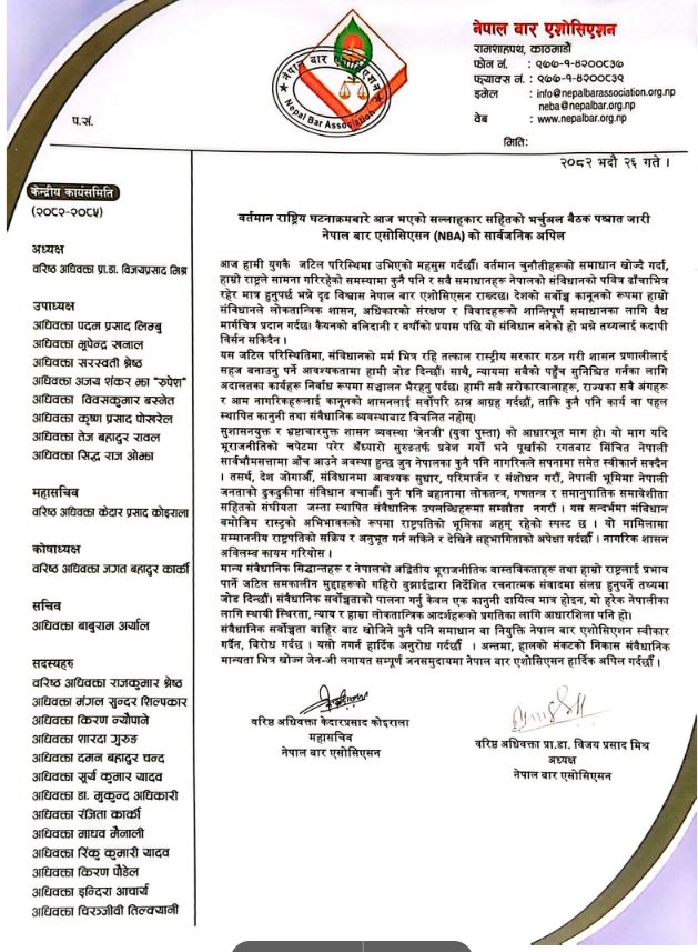 काठमाडौ । नेपाल बार एसोसिएसनले संवैधानिक सर्वोच्चता बाहिरबाट खोजिने कुनै पनि समाधान वा नियुक्ति नस्वीकार्ने र विरोध गर्ने जनाएको छ। बिहीबार अहिलेको घटनाक्रमबारे बसेको भर्चुअल बैठकपछि सार्वजनिक अपिल जारी गर्दै नेपाल बार एसोसिएसनले संवैधानिक सर्वोच्चताको कायम राख्न अपिल गरेको हो।‘संवैधानिक सर्वोच्चता बाहिरबाट खोजिने कुनै पनि समाधान वा नियुक्ति नेपाल बार एसोसिएसन स्वीकार गर्दैन, विरोध गर्दछ। यसो नगर्न हार्दिक अनुरोध गर्दछौं,’ अपिलमा भनिएको छ, ‘अन्तमा, हालको संकटको निकास संवैधानिक मान्यता भित्र खोज्न जेन-जी लगायत सम्पूर्ण जनसमुदायमा नेपाल बार एसोसिएसन हार्दिक अपिल गर्दछौँ।’
