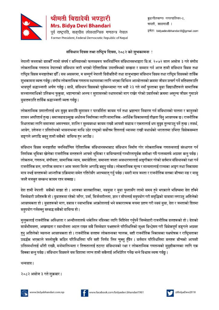 काठमाडौं । पूर्वराष्ट्रपति विद्यादेवी भण्डारीले देशलाई राजनीतिक अस्थिरता र अन्योलतातर्फ धकेलिन नदिन राजनीतिक दलहरुले मिहिनेतपूर्वक काम गर्नुपर्ने बताउनुभएको छ ।संविधान दिवसको अवसरमा आज शुभकामना सन्देश जारी गर्दै पूर्वराष्ट्रपति भण्डारीले देशको सार्वभौमसत्ता, अखण्डता र स्वाधिनता अटल राख्न सबै जिम्मेवारी पक्षले परिस्थितिको सुक्ष्म विश्लेषण गरी विवेकपूर्ण ढंगले अग्रसर हुनपर्ने बताउनुभएको हो । उहाँले वर्तमान परिस्थितिमा दलहरु बीचको आपसी प्रतिस्पर्धालाई थाँती राख्दै, मनोमालिन्यता र तिक्ततालाई हटाएर संविधानको रक्षा र लोकतान्त्रिक गणतन्त्रको सुदृढीकरणका लागि एक ढिक्का हुन आह्वानसमेत गर्नुभएको छ ।