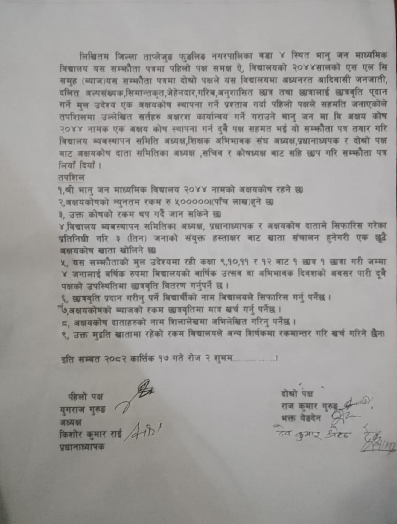 ताप्लेजुङ ।भानु माध्यमिक विद्यालयका पूर्व विद्यार्थीहरूले १० लाख बराबरको अक्षयकोष स्थापना गरेको छ । भानु माध्यमिक विद्यालय २०४४ सालमा एसएलसी परीक्षामा सामेल पूर्व विद्यार्थीहरूबाट विद्यालयको सम्मुनति र जेहेन्ददार विद्यार्थीहरूको प्रगतिको लागि १० लाख अक्षय कोष जम्मा गर्ने प्रतिवद्धता सहित आज ५ लाख ५२ हजार ६८१ रकम अक्षयकोष स्थापना गरेको हो ।