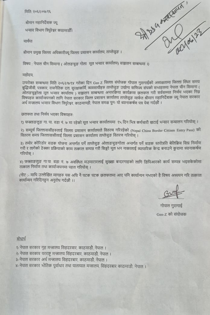 जेनजीले गराए महानिर्देशकको ध्यानाकर्षण ताप्लेजुङको ओलाङचुङगोला भन्सारमा सात दिन भित्रमा कर्मचारी पठाउने