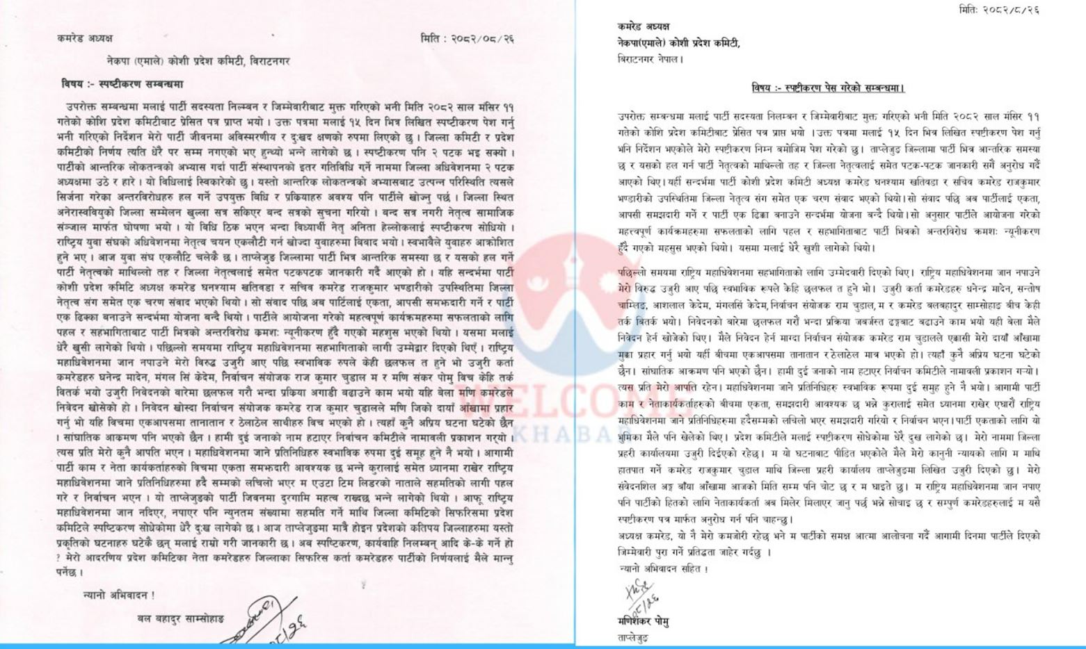 सोही पत्रका आधारमा आज १४ दिन स्पष्टीकरण बुझाइएको बताईएको छ । प्रदेश कमिटी अध्यक्षलाई सम्बोधन गरी बुझाइएको पत्रमा भनिएका छ । पत्रमामा भनिएको छ । ताप्लेजुङ जिल्लामा पार्टी भित्र आन्तरिक समस्या छ र यसको हल गर्न पार्टी नेतृत्वको माथिल्लो तह र जिल्ला नेतृत्वलाई समेत पटक-पटक जानकारी सँगै अनुरोध गर्दै आएको थिए। यहीं सन्दर्भमा पार्टी कोशी प्रदेश कमिटी अध्यक्ष कमरेड घनश्याम खतिवडा र सचिव कमरेड राजकुमार भण्डारीको उपस्थितिमा जिल्ला नेतृत्व संग समेत एक चरण संवाद भएको थियो। सो संवाद पछि अब पार्टीलाई एकता, आपसी समझदारी गर्ने र पार्टी एक टिक्का बनाउने सन्दर्भमा योजना बन्दै थियो । सो अनुसार पार्टीले आयोजना गरेको महत्त्वपूर्ण कार्यक्रमहरूमा सफलताको लागि पहल र सहभागिताबाट पार्टी भित्रको अन्तरविरोध क्रमशः न्यूनीकरण हुँदै गएको महसुस भएको थियो। यसमा मलाई धेरै खुशी लागेको थियो ।पछिल्लो समयमा राष्ट्रिय महाधिवेशनमा सहभागिताको लागि उम्मेदवारी दिएको थिए। राष्ट्रिय महाधिवेशनमा जान नपाउने मेरो विरुद्ध उजुरी आए पछि स्वभाविक रूपले केही छलफल त हुने भो उजुरीकर्ता कमरेडहरू धनेन्द्र मादेन, सन्तोष चाम्लिङ, आशलाल केदेम, मंगलसि केदेम, निर्वाचन संयोजक राम चुडाल, म र कमरेड बलबहादुर साम्सोहाङ बीच केही तर्क वितर्क भयो