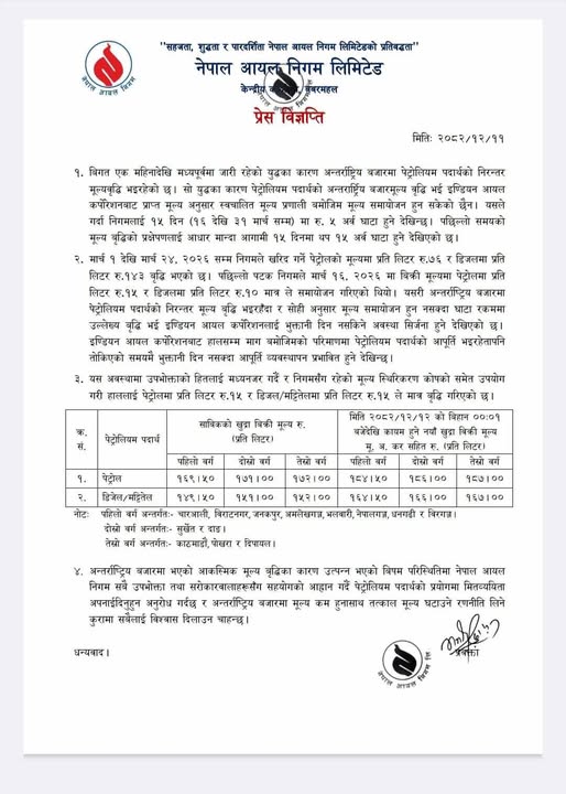 काठमाडाैँ । नेपाल आयल निगमले पेट्रोलियम पदार्थको मूल्य फेरि बढाएको छ । निगमले बुधबार प्रेस विज्ञप्ति जारी गर्दै पेट्रोल,डिजेल र मट्टीतेलमा समान १५ रुपैयाँ बढाइएको जानकारी दिएकाे हो ।